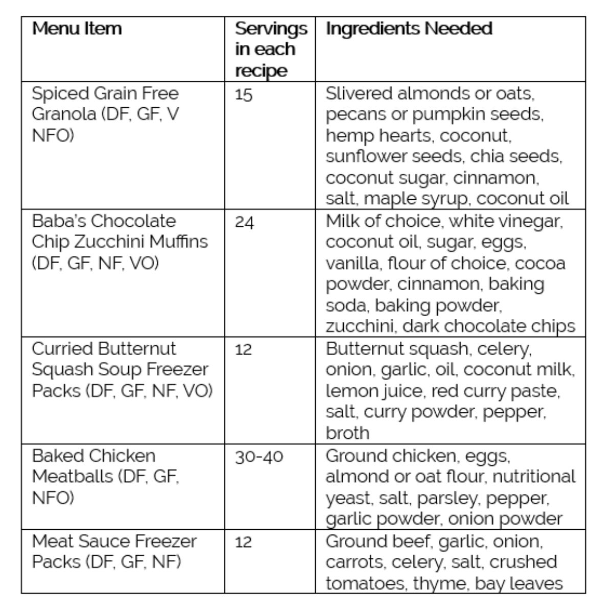 In this cooking class you will learn to stock your freezer with batch cook meals and snacks such as spiced grain free granola, chocolate chip zucchini muffins, curried butternut squash soup freezer packs, meat sauce freezer packs and baked chicken meatballs.