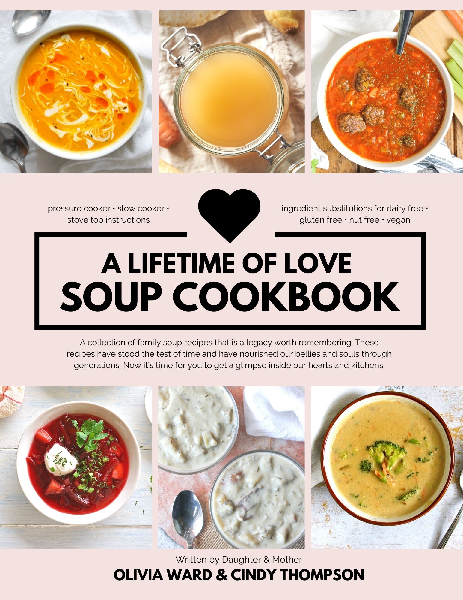 This book was written by daughter and mother, Olivia Ward and Cindy Thompson in 2021, to capture a legacy of recipes that have stood the test of time. When Cindy passed away in 2022, Olivia knew that now was time to share a glimpse into their hearts and kitchens, where so much love was infused into soup.