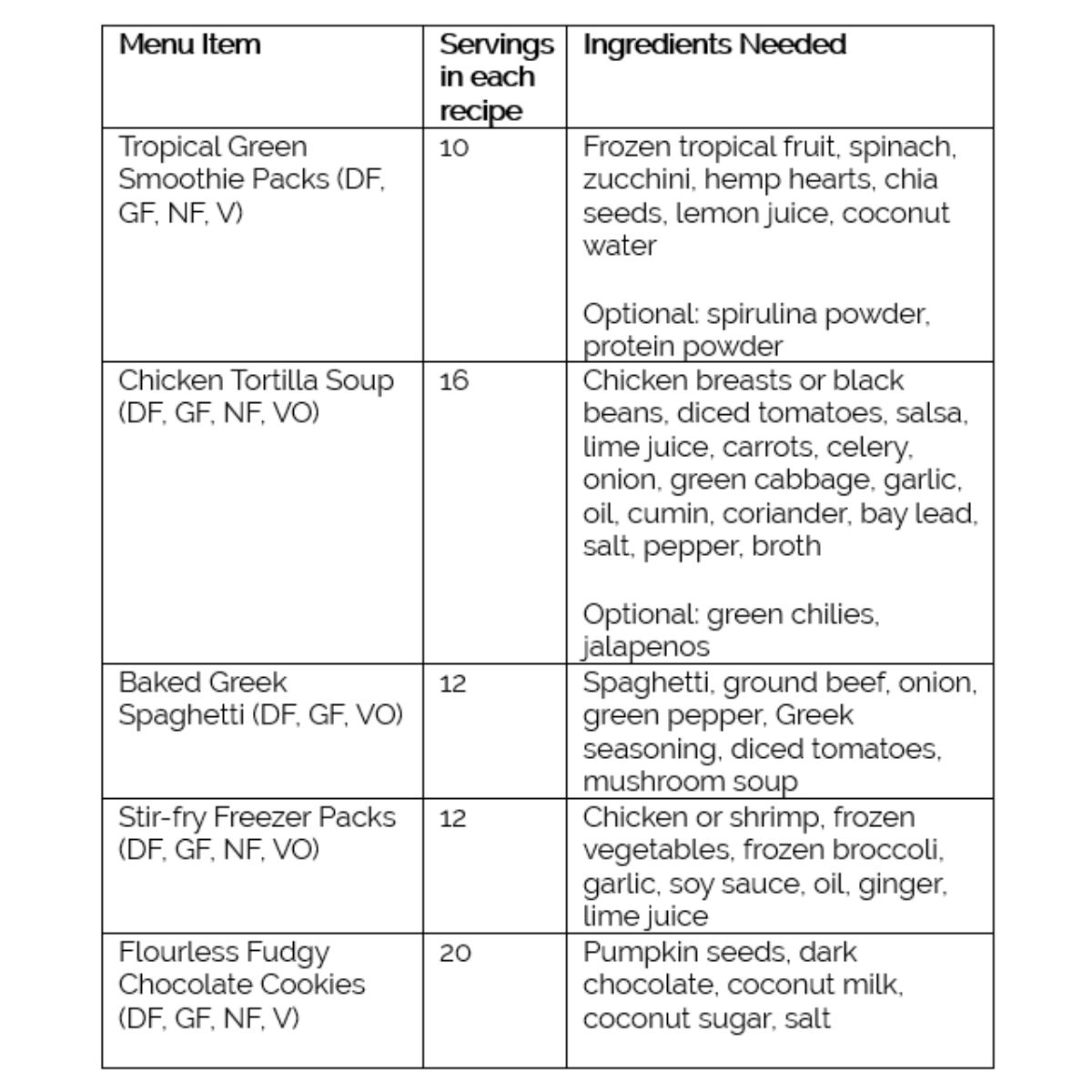 In this cooking class you will learn to stock your freezer with batch cook meals such as flourless fudgy chocolate cookies, tropical green smoothie packs, stir-fry freezer packs, baked Greek spaghetti and chicken tortilla soup.