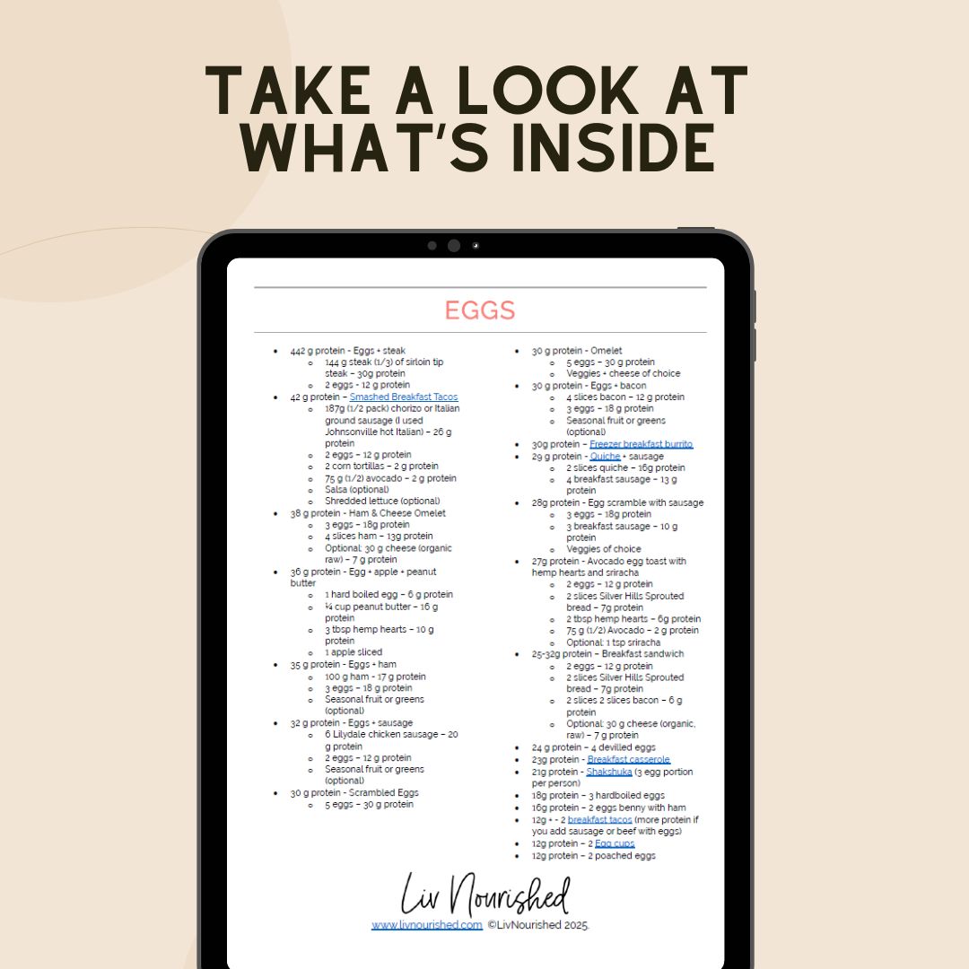 Inside this guide, you will find over 100 high protein breakfast, meal and snack ideas coming from whole food sources to help you meet your protein goals without the confusing calculations.